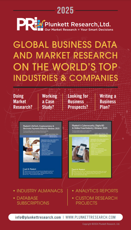 While you’re thinking about data, check out this overview of our Plunkett Research Online database subscriptions, used daily by the world’s leading schools of business, government agencies, consultancies and corporate strategists.